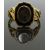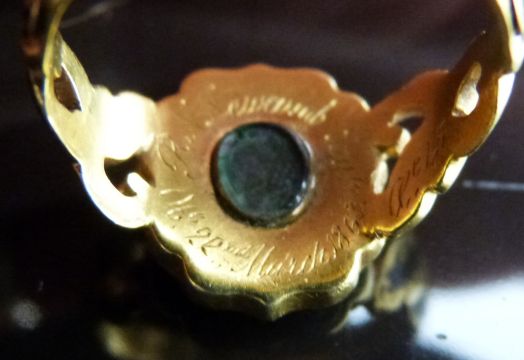 Victorian 18ct gold mourning ring set with hair to the central glass compartment, with pierced and scrolling black enamel decoration to the shoulders and to the underside of the ring another glass compartment and inscribed "R.N.Newcomb Esq Obt 22nd March 1863 at 45" maker A & S, size J, 2.71g