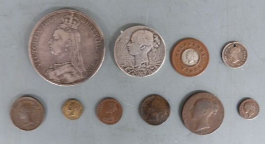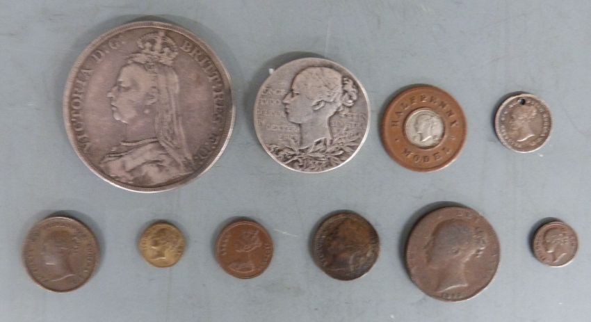 Ten Victoria coins to include Jubilee crown, commemorative coin, model penny, halfpenny and half farthing, fraction farthings and a pierced Maundy twopence