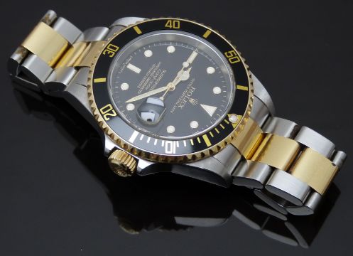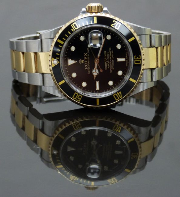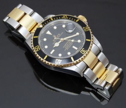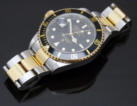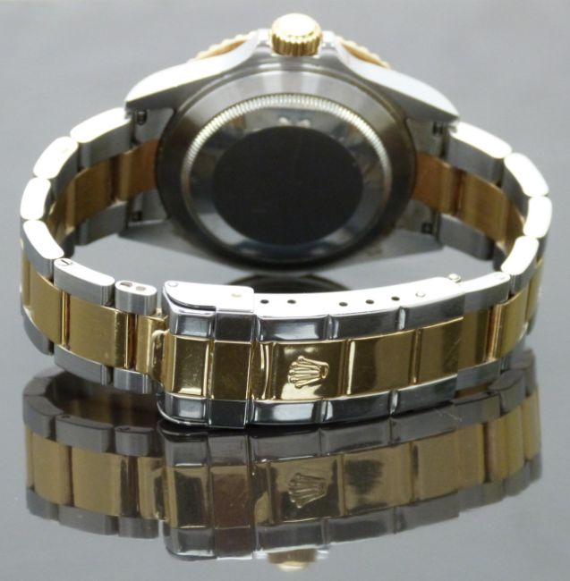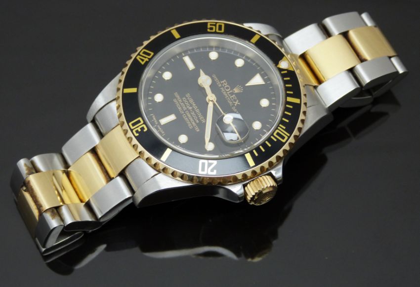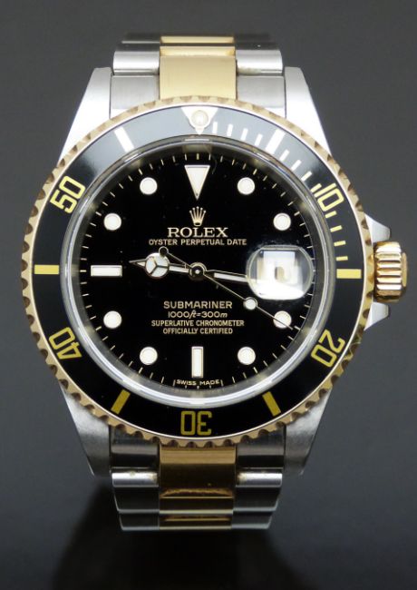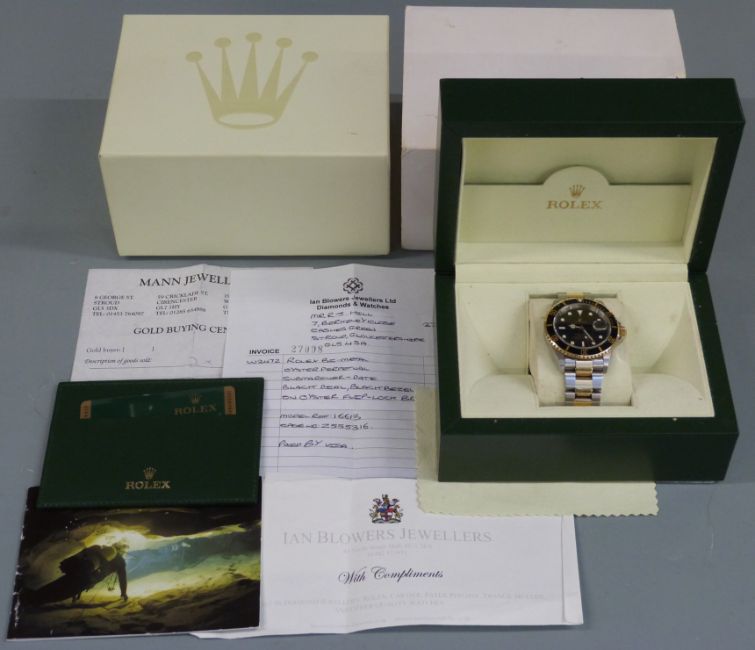 Rolex Oyster Perpetual Date Submariner gentleman's diver's automatic wristwatch ref. 16613 with date aperture, luminous hands and markers black dial, gold Arabic numerals to the black bezel, stainless steel case and signed 21 jewel calibre 3135 movement, on two-tone bracelet, case diameter 40mm, serial number Z555316, in original box with guarantee card, purchase receipt, related paperwork, spare links, charms and outer box.
