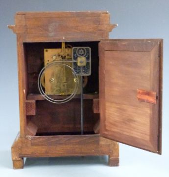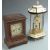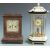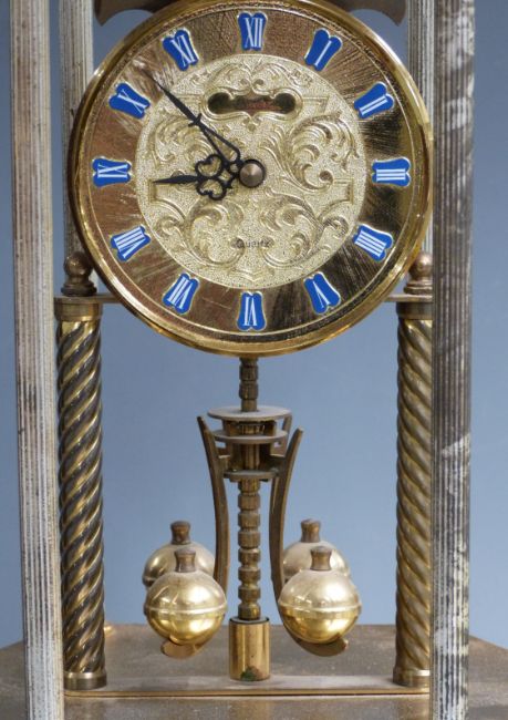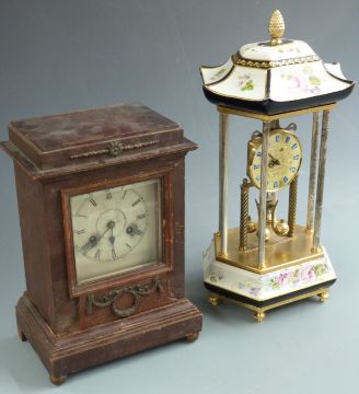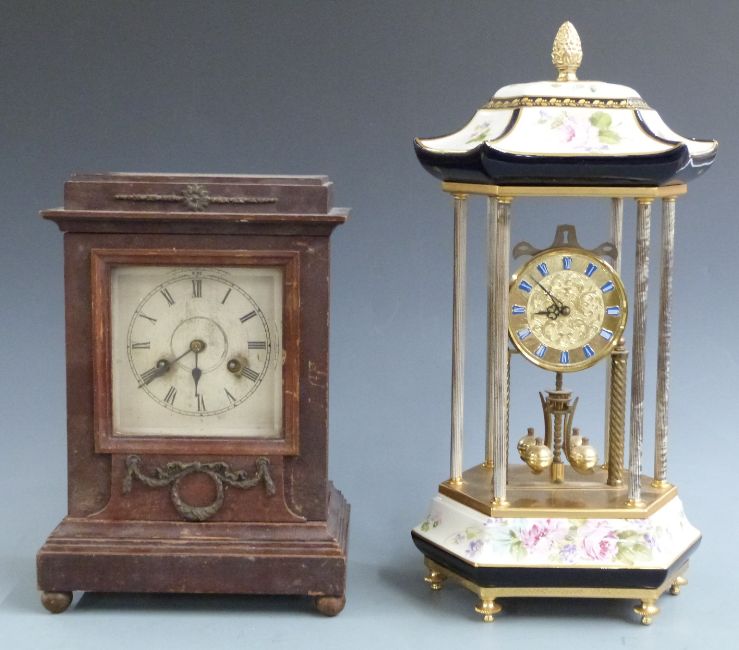 French style six pillar Anniversary clock with painted ceramic pergola top and matching hexagonal base, the quartz movement by Haller of Germany together with a two train Junghans wooden mantel clock, tallest 47cm