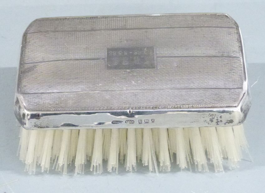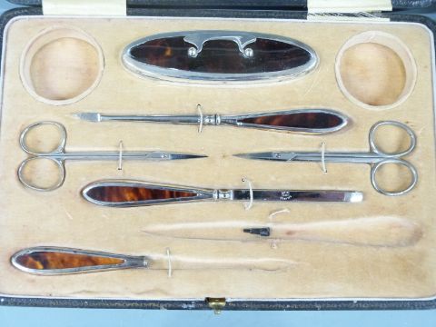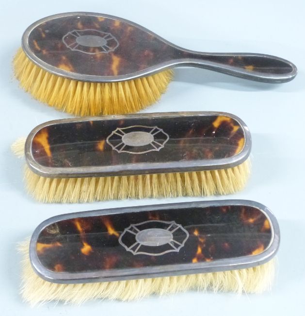 Hallmarked silver and tortoiseshell mounted manicure set in original fitted case together with three similar hallmarked silver mounted brushes and a further brush