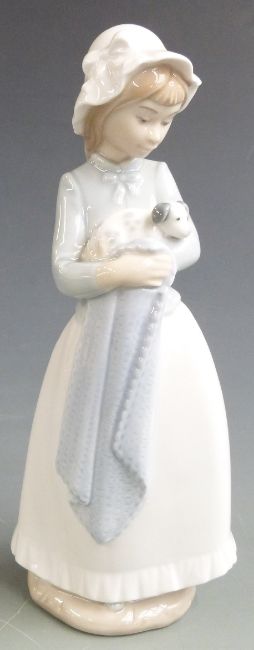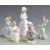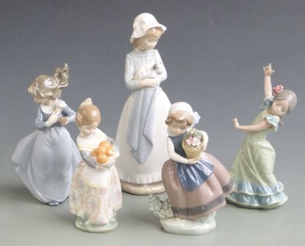 Nao figurine of a girl holding a puppy and four Lladro child figures, tallest 25cm