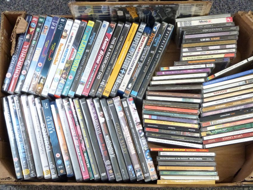 Approximately 40 DVDs some new and sealed plus 50 CDs and six metal signs