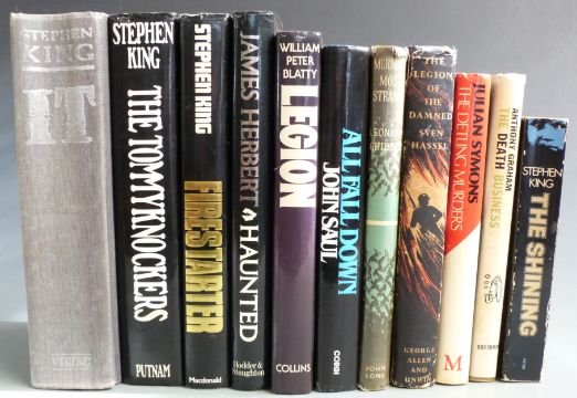 [Horror] Stephen King “It” published Viking 1986, Firestarter 1980, The Shining, The Tommyknockers 1987, William Peter Blatty Legion 1983, Sven Hassel The Legion of The Damned 1957, John Saul All Fall Down 1983, James Herbert Haunted, Symons Detling Murders, Anthony Graham The Death Business and Gribble Murders Most Strange 1959, most in dust-wrappers (11)