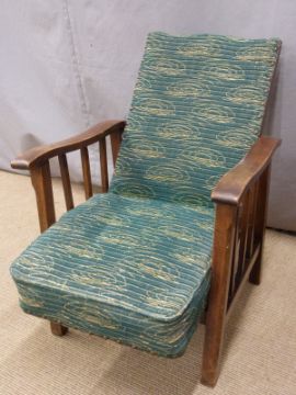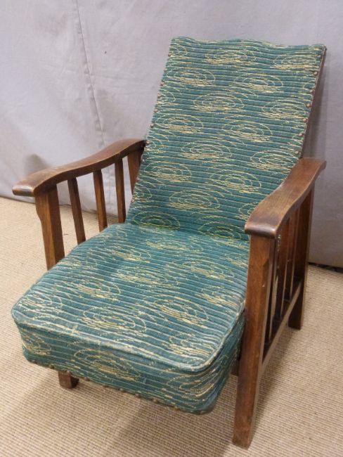 19thC mahogany piano stool with carved frieze, raised on cabriole legs and a child's upholstered reclining armchair