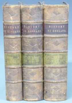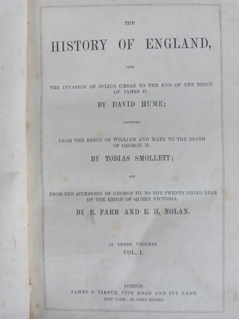 The History of England from The Invasion of Julius Caesar to the End of the Reign of James II by David Hume, continued to the Death of George II by Tobias Smollett and From the Accession of George III to Twenty-Third Year of the Reign of Queen Victoria by E. Farr & E.H. Nolan, published James Virtue (c1870) in 3 volumes illustrated with many engravings, portraits and titles, bound in half leather with raised bands and gilt lettered labels (3)