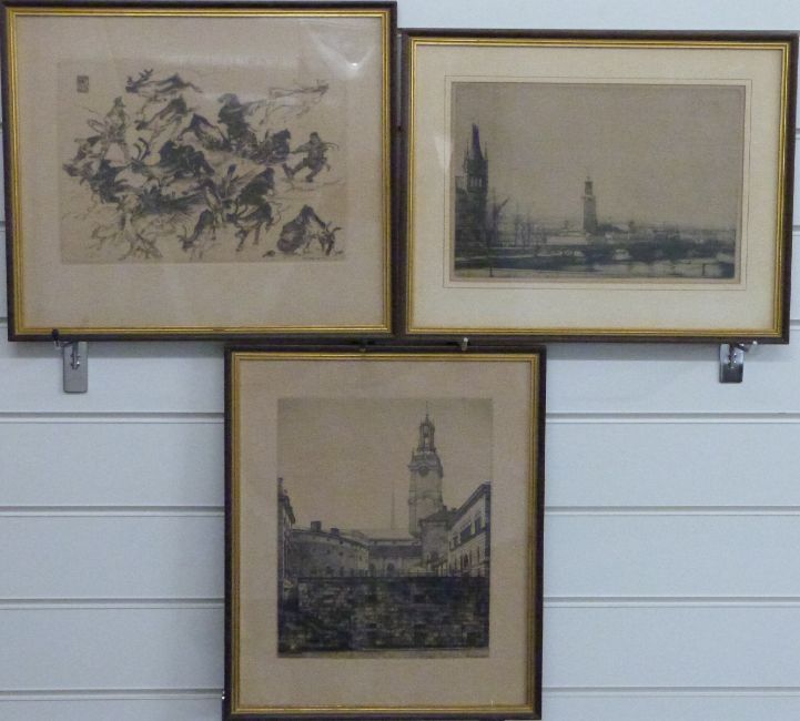 Harald Sellberg Swedish etching dated 1926 together with a further similar scene monogrammed AF and another possibly monogrammed BE and dated 1931, depicting reindeer with handlers struggling to maintain order, each 21 x 30cm