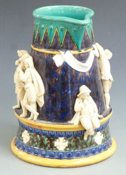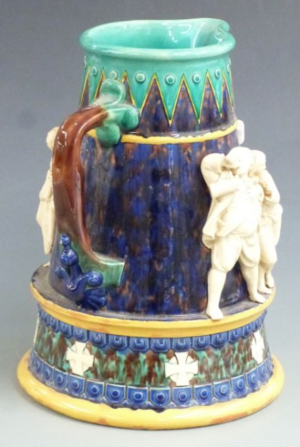 A large 19thC majolica jug or pitcher with applied figural decoration of courting couples drinking and smoking. Impressed 'Bolton Castle' to neck and indistinct impressed mark to base, possibly Minton, H 33cm, maximum diameter 24.5cm