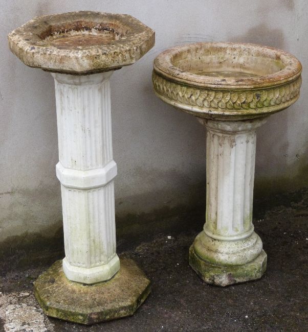 Two garden bird baths with fluted column supports, height of taller 75cm