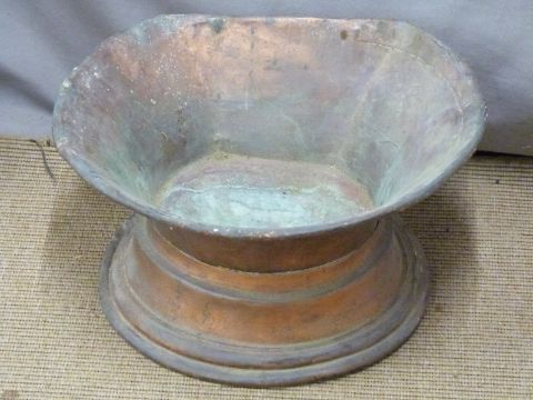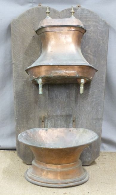 Continental copper basin and cistern mounted on oak panel, the cistern with engraved armorial and laurel leaf surround, height 92cm