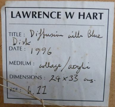 Lawrence W Hart, collage and acrylic 'Diffusion with blue disk', initialled lower left, with details verso, 22 x 33cm