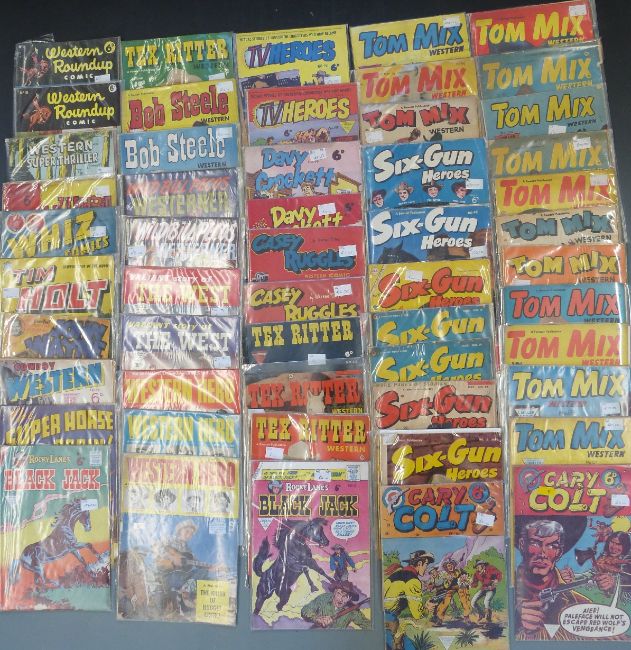 Approximately  50 Western comics including Tom Mix, Six-Gun Heroes, TV Heroes, Davy Crockett, Casey Ruggles, Tex Ritter, Bob Steele, Wild Bill Pecos, Valiant Story of the West, Western Hero, Western Roundup, Blackjack, Cary Colt etc.
