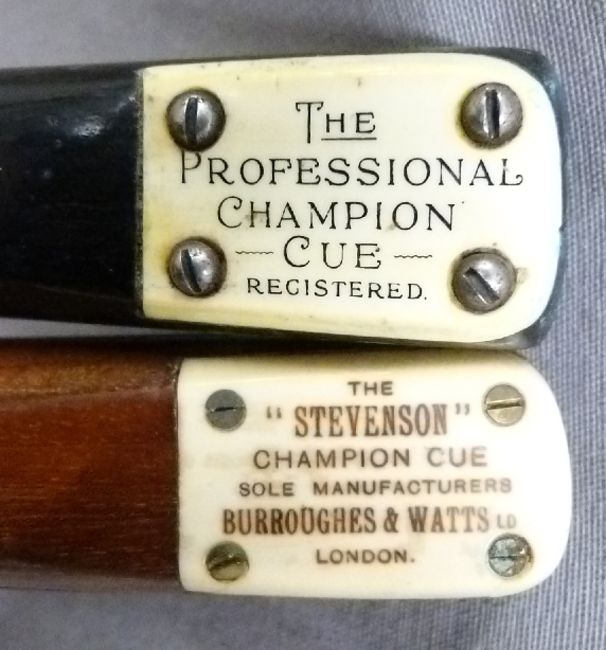 Two cased snooker or pool cues, one "Stevenson" champion cue by Burroughes & Watts Ltd in original metal case the other the professional champion cue