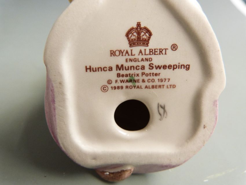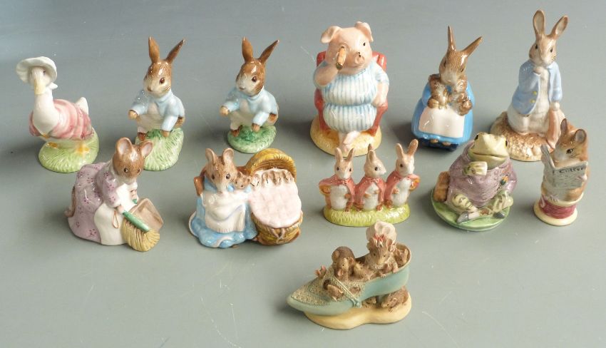 Twelve Royal Albert, Beswick and Border Fine Arts Beatrix Potter figures including Peter with Red Pocket Handkerchief, Hunca Munca, Tailor of Gloucester, Jeremy Fisher etc, most boxed
