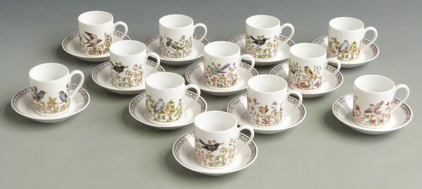 Hutschenreuther twelve coffee cans and saucers, decorated with birds