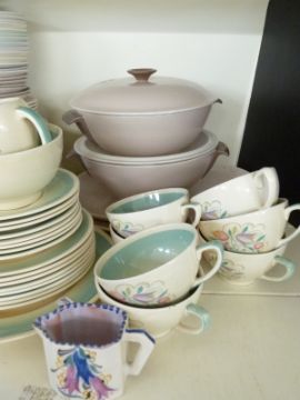 A collection of Poole pottery and Susie Cooper dinner, tea and decorative ware including an early Poole jug decorated with harebells, tallest 15cm