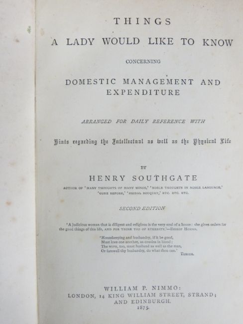 The New Female Instructor or Young Woman's Guide to Domestic Happiness (c1818) with engraved title & frontispiece and 6 engraved plates (original binding with much loss), Mrs. Beeton's Every-Day Cookery with 16 plates in colour & nearly 300 illustrations 1923, Things A Lady Would Like to Know Concerning Domestic Management & Expenditure by Henry Southgate 1875, The Interview 1862, Facts and Hints for Every-Day Life (c1890), Selfridge's Household Encyclopaedia 1929 and 4 others (10)