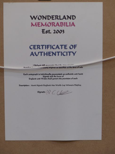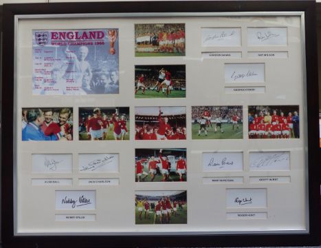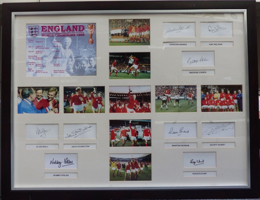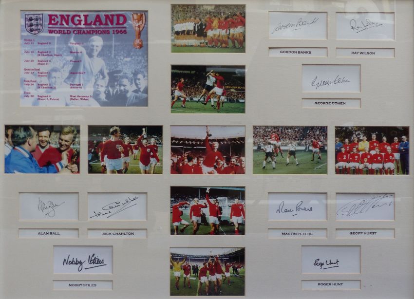 A montage of England Football World Champions 1966 signatures comprising Alan Ball, Nobby Stiles, Jack Charlton, Gordon Banks, Ray Wilson, George Cohen, Martin Peters, Geoff Hurst and Roger Hunt, 67 x 87cm overall, with certificate of authenticity verso