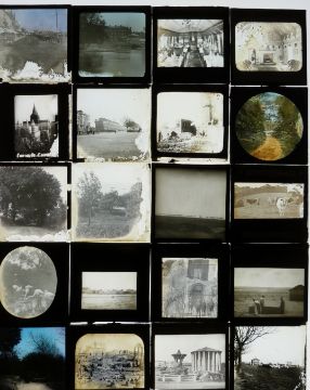 Approximatley forty glass photographic slides including sailing boats, fishing village, townscapes, flamingos, country life etc