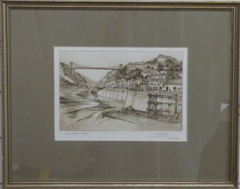Harold Sayer signed limited edition (25/150) engraving 'Clifton Suspension Bridge' from a 1935 drawing by Nancy Bradfield, 20 x 28cm