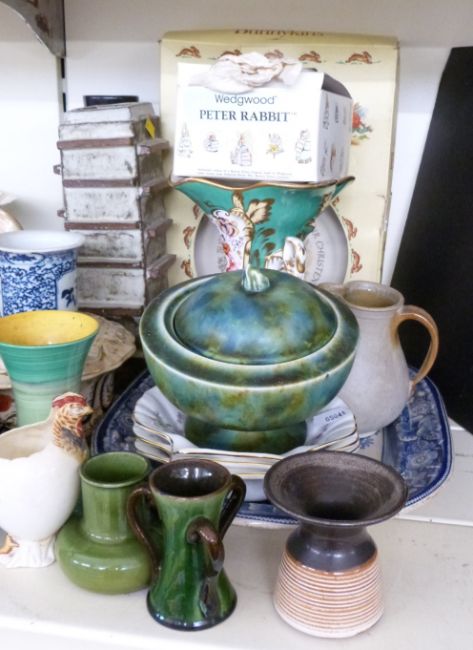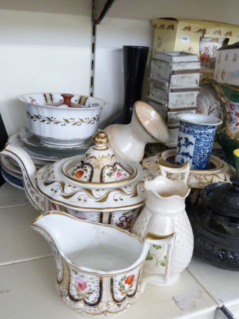 19thC and later ceramics including Old Derby, Imari, Coalport style vase, Copeland hen jug, Studio pottery, Royal Doulton and other boxed nursery ware, Meir and Son "Wild Rose" meat plate etc, tallest 25cm