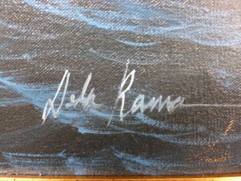 Oil on canvas of maritime scene depicting two sailing ships, indistinctly signed bottom right possibly Rama, 72 x 127cm, in gilt frame