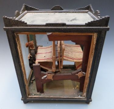 Model weaving loom in glass display case, height 36cm