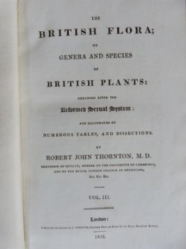 The British Flora; or Genera and Species of British Plants: Arranged after the Reformed Serual System and Illustrated by Numerous Tables and Dissections, by Robert John Thornton printed J. Whiting 1812 first edition in 5 volumes, illustrated with many plates throughout, finely bound in full leather with gilt borders and gilt spine lettering and bands (5)