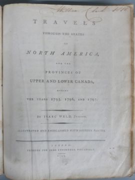 Travels Through The States of North America And The Provinces of Upper And Lower Canada, During The Years 1795, 1796 and 1797 by Isaac Weld Junior, Illustrated and Embellished  with Sixteen Plates of Maps & Views printed for John Stockdale, Piccadilly 1799 first edition rebacked in leather with raised bands over original leather boards, lacking one plate and with several tears to folding hand-coloured map
