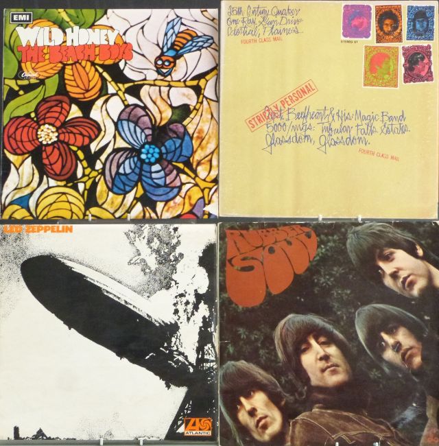 Approximately 35 albums including Led Zeppelin (1 and 2 both plum), The Beatles (With, Rubber Soul and Pepper all black/yellow), Richie Havens (Blind Degree, Alarm Clock and State of Mind), The Beach Boys (Wild Honey and Friends), Captain Beefheart (Strictly Personal and Safe As Milk), Cream (Disraeli, Wheels and Goodbye)