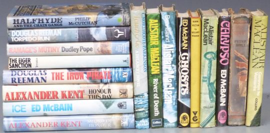 Alistair MacLean Where Eagles Dare 1967, Bear Island 1971, Alexander Kent Honour This Day 1987, Sword of Honour 1998, Dudley Pope Ramage's Mutiny 1977, C. Northcote Parkinson Touch & Go 1977 signed copy, Peter Bull To Sea in A Sieve 1956 signed copy, Douglas Reeman Torpedo Run 1981, Trevanian The Eiger Sanction, Hillary Waugh Born Victim 1963, Ed McBain and Philip McCutchan books, all in dust-wrappers (17)