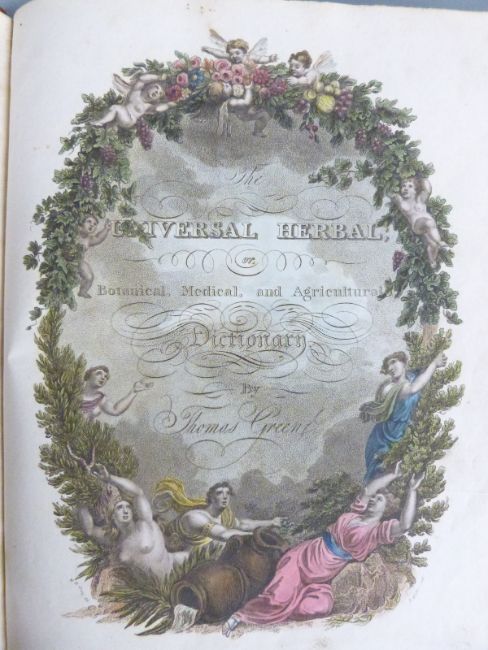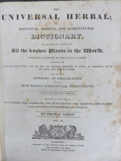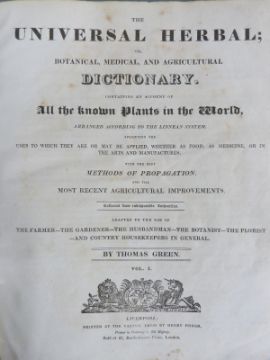 The Universal Herbal; or Botanical, Medical and Agricultural Dictionary. Containing An Account of All The Known Plants in the World Arranged according to the Linnean System specifying the uses to which they are or may be applied, whether as Food, as Medicine, or in the Arts and Manufactures, by Thomas Green, printed at The Caxton Press by Henry Fisher (1816-1820) with frontispiece in each volume and illustrated title volume 1 (108 hand-coloured plates total), bound in half leather with gilt title labels (2)