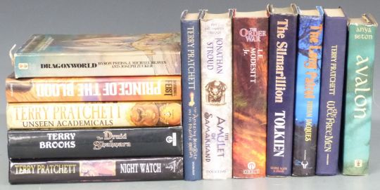 [Fantasy] Prince of The Blood by Raymond E. Feist 1989 signed copy, The Druid of Shannara by Terry Brooks 1991 signed copy, Terry Pratchett Unseen Academicals 2009, Night Watch 2002, and The Wee Free Men 2003, J.R.R. Tolkien The Silmarillion 1977 with map, Anya Seton Avalon 1966, Preiss & Reaves Dragonworld 1979, Brian Jacques The Long Patrol, L.E. Modesitt The Order of War and 2 others, most in dust-wrappers (12)