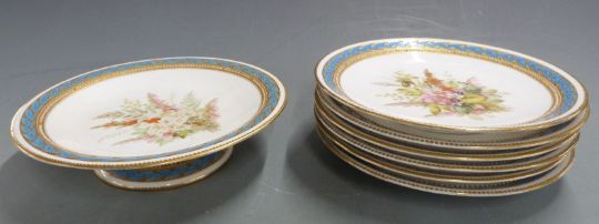Royal Worcester dessert service of six plates and a tazza with hand-painted botanical decoration and jewelled borders, diameter 23cm