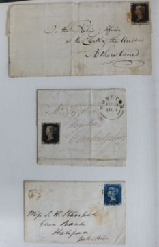 A good Great Britain cover collection comprising pre stamp covers including Bishop's Marks, an 1827 leaflet advertising cockfighting, four Mulreadys & a Gilpin ocean penny postage envelope, two 1840 1d black on cover and two 2d blue on cover including good four margin with red M/C, eight 1d red brown on cover, five overseas covers, two humorous 1/2d on cover, early overseas postcards, 1935 Silver Jubilee cover, good range George VI and early QEII covers