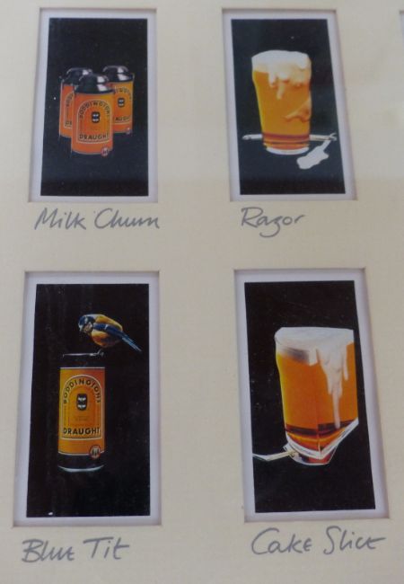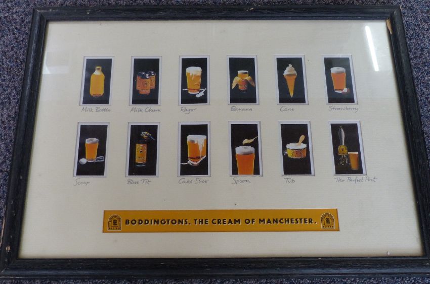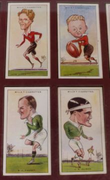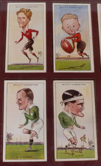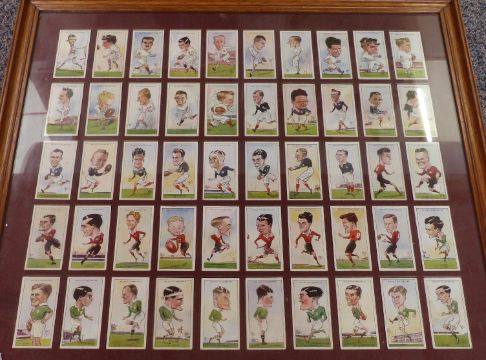 Framed and glazed set of Wills's cigarette cards 'Rugby Internationals' and Boddington 'Cream of Manchester' cards