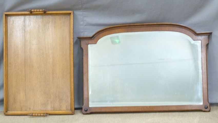Large oak twin handled tray, length 72cm and wooden framed bevelled edge mirror