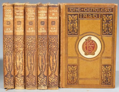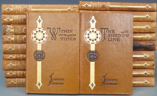 [Bindings] Novels of Joseph Conrad (c.1920s) comprising 19 volumes uniformly bound in leather with a Celtic colour and gilt design, with a collection of books by A.A. Milne and E.V. Lucas (c1920s) in matching gilt, colour and blind stamped leather (30)