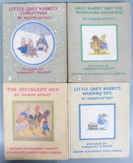 Collection of Little Grey Rabbit Books by Ailson Uttley with pictures by Margaret Tempest including The Squirrel The Hare and The Little Grey Rabbit 1952, Wise Owl’s Story 1951, Little Grey Rabbit’s Party 1953, Hare Joins Home Guard, The Knot Squirrel Tied, Moldy Warp the Mole, Water-Rat’s Picnic, Fuzzypeg Goes to School etc adorned with colour plates, mostly in dust-wrappers (18)