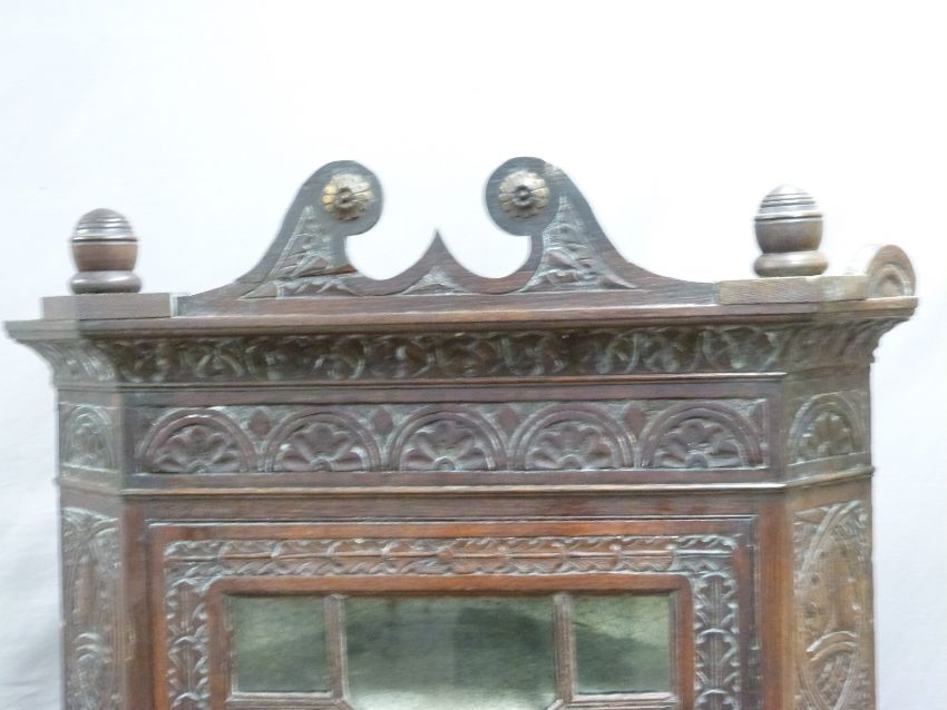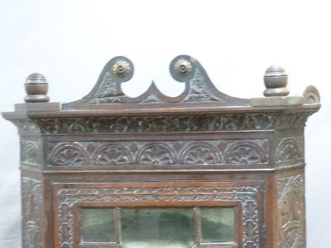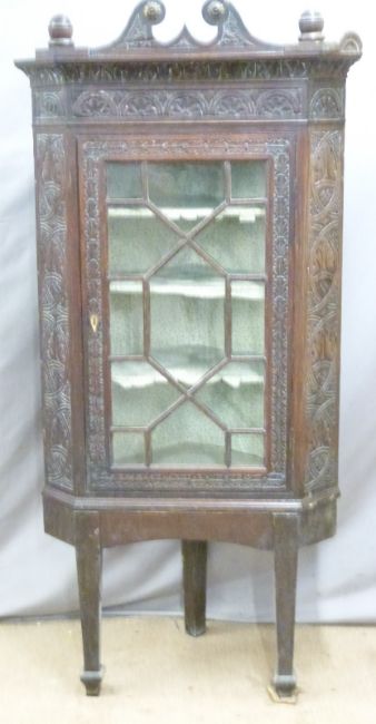 Carved Georgian oak glazed corner cupboard on stand, height 181cm