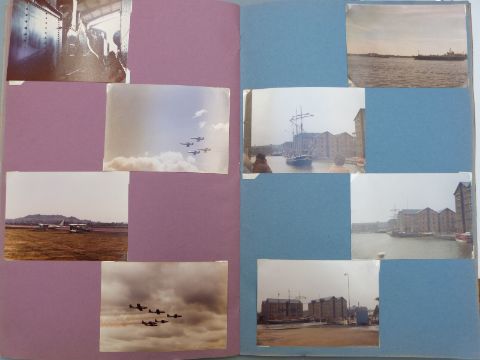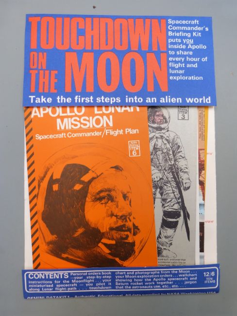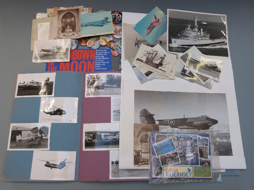 Quantity of transport related ephemera including "Touch Down on the Moon" educational pack from NASA, pin badges including motoring interest examples, Revolver Records, two albums of airshow and similar photographs