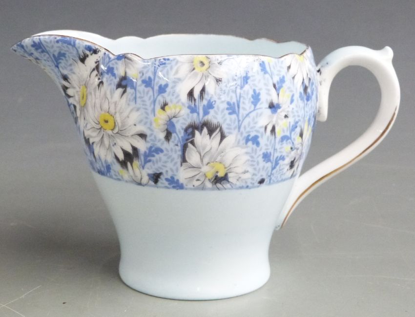 Shelley part tea set comprising six trios, sugar and milk all decorated with daisies, shape no 13202