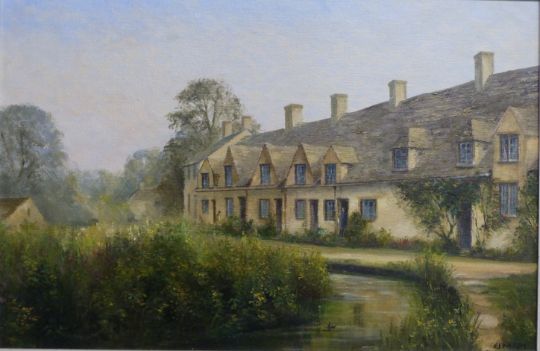 E.J Wilson oil on board Arlington Row, Bibury, Cotswold village scene, signed lower right and titled verso, 34 x 52cm