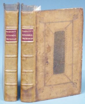 Dictionarium Botanicum: Or, A Botanical Dictionary for The Use of the Curious in Husbandry and Gardening containing The Names of the Known Plants in Latin, English &c Their Description, Their Culture or Management rendered easy and familiar, whether Domestick or Exotick; so that the Name of a Plant being known the proper Direction for its Improvement in the Garden is to be found in the same Article, A Work never before attempted, by R. Bradley printed for T. Woodward 1728 in 2 volumes first edition with engraved folding frontispiece in volume 1. Blind stamped calf re-backed in leather with raised bands and gilt lettered leather labels (2)