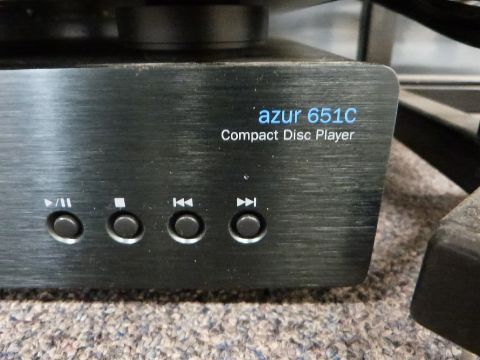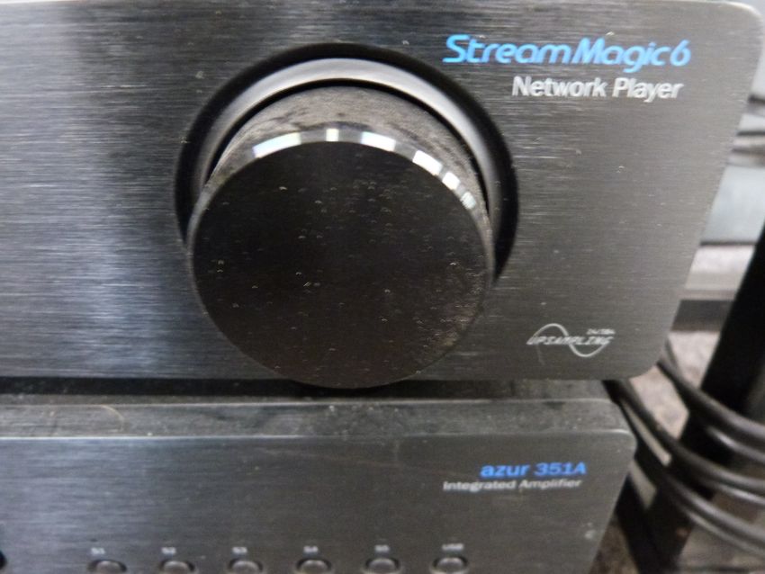Cambridge Audio azur stacking audio system with a pair of speakers in teak cabinets on stands
