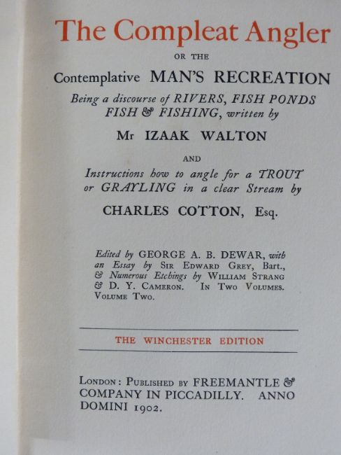 The Compleat Angler or the Contemplative Man's Recreation Being a discourse of Rivers, Fish Ponds, Fish & Fishing written by Mr. Izaak Walton and Instructions how to angle for a Trout or Grayling in a clear Stream by Charles Cotton Esq with Numerous Etchings by William Strang and D.Y. Cameron, published Freemantle 1902 in 2 volumes (Winchester Edition), bound in publisher's gilt cloth (2)