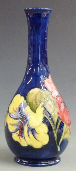Moorcroft pedestal bottle vase in Hibiscus pattern on a blue ground, H 27cm