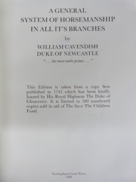 A General System of Horsemanship In All It’s Branches by William Cavendish Duke of Newcastle, taken from a copy first published in 1743 which had been kindly loaned by His Royal Highness The Duke of Gloucester, published Nottingham Court Press 1980 limited to 500 numbered copies sold in aid of The Save The Children Fund signed by the Duke of Beaufort illustrated folio bound in full leather with raised bands and gilt lettered title label