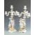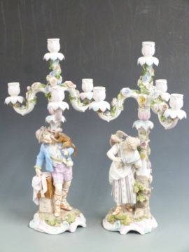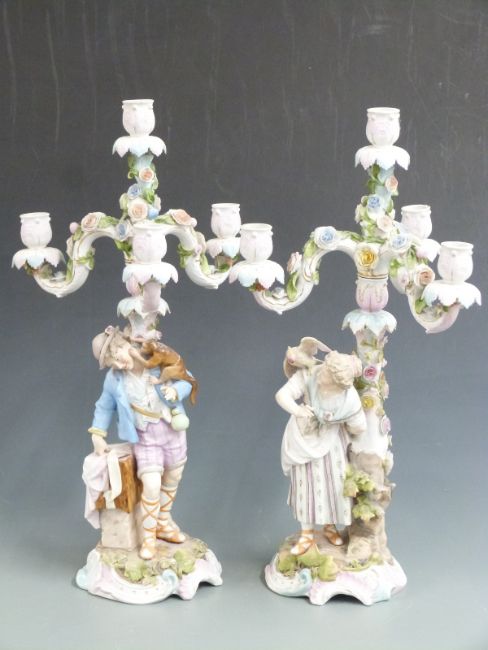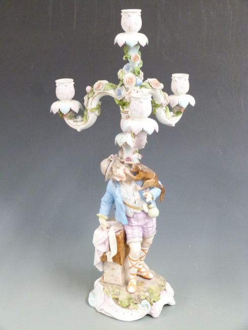 A pair of 19thC German figural candelabra with a monkey and parrot on the figures' shoulders, H 53cm