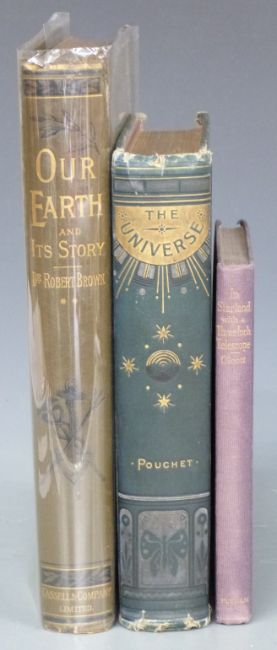 The Universe or The Infinitely Great and The Infinitely Little by F.A. Pouchet, illustrated by 270 engravings and a colour-printed frontispiece, published Blackie (c1880s) in decorated binding, Our Earth and Its Story edited by Robert Brown with 12 coloured plates, maps and 262 woodcuts 1888 in bright gilt illustrated binding and In Starland with a Three-Inch Telescope by Olcott 1911 in gilt cloth (3)